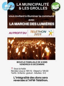 Les Grolles se joignent à la Municipalité pour vous inviter à illuminer la commune avec LA MARCHE DES LUMIERES au profit du Téléthon. Une boucle famille de 4 kms vous attend le vendredi 5 décembre. Rendez-vous sous la Halle à 18h15 avec un départ à 18h30.